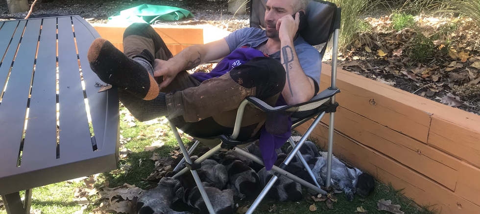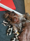 Puppies are weighed twice daily and any weight loss or stall is triaged. Temps dropping below 94 or rising above 100 stop digestion, and several other processes. Pups thus must be kept hydrated and warm - and Mom too! The whelping room is 80 degrees the first three days, so we rotate ice packs for Nini once she settles down to nurse. High quality (and quantity) maternal attention has been demonstrated in many species to be critical to the physiological health of puppies as adult, particularly in ensuring a health stress response. The breeder sets up an environment designed to make Mom as content as possible to maximize the time with her babies (however, this is a rare concern in the drahthaar breed, who tend to be dedicated mothers). Nini leaves her puppies for no more than ten minutes every few hours to relieve herself, although she has been going on a daily light jog since the third day.