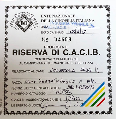 Vroni is a precision hunter and stylish pointer who cooperates closely with her handler. One of our finest dams, her progeny include Eike della Ca' Rigada, In addition to her breed exams. Vroni has also placed and qualified in FCI ENCI hunting and breed specialty trials. Vroni has A hips and is clear of elbow dysplasia, osteocondritis dissecans, and all other testable genetic disease per Embark DNA testing (including breed-specific concerns such as Von Willebrand)..